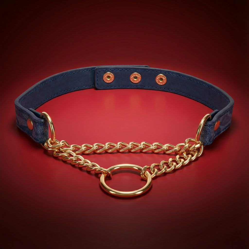 Navy faux-leather day collar with subtle gold hardware