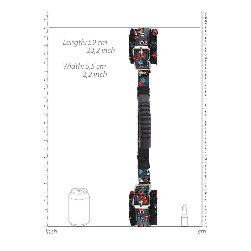 The Ouch Old School Tattoo Printed Handcuffs With Handle are sturdy leather bondage cuffs designed for players who enjoy firm restraint and a bold, retro aesthetic. Made from durable leather with strong metal hardware, they offer a secure hold during intense scenes, while the soft inner lining keeps the wrists comfortable even in longer sessions. The tattoo inspired print adds a striking visual edge to your bondage gear collection.